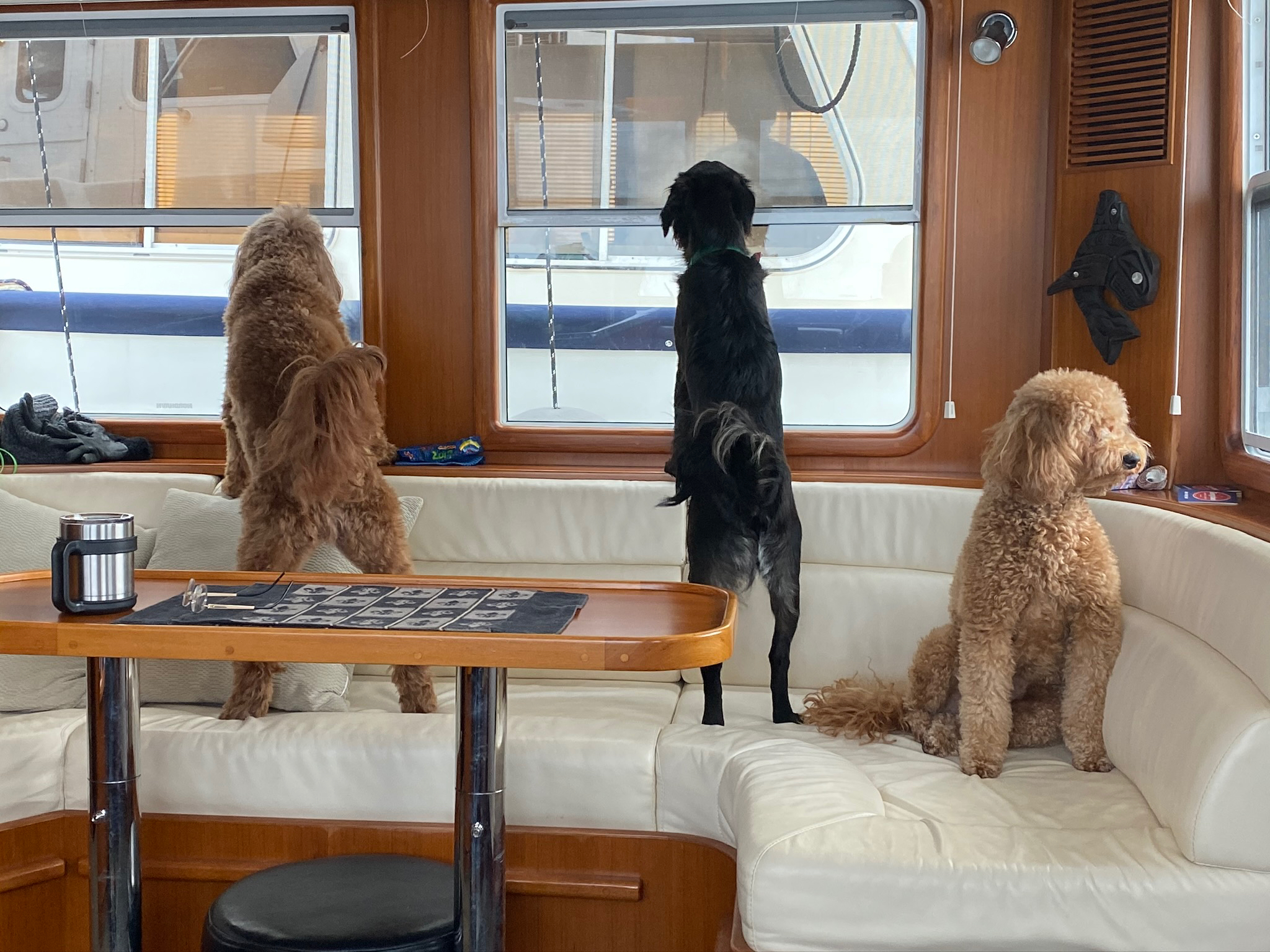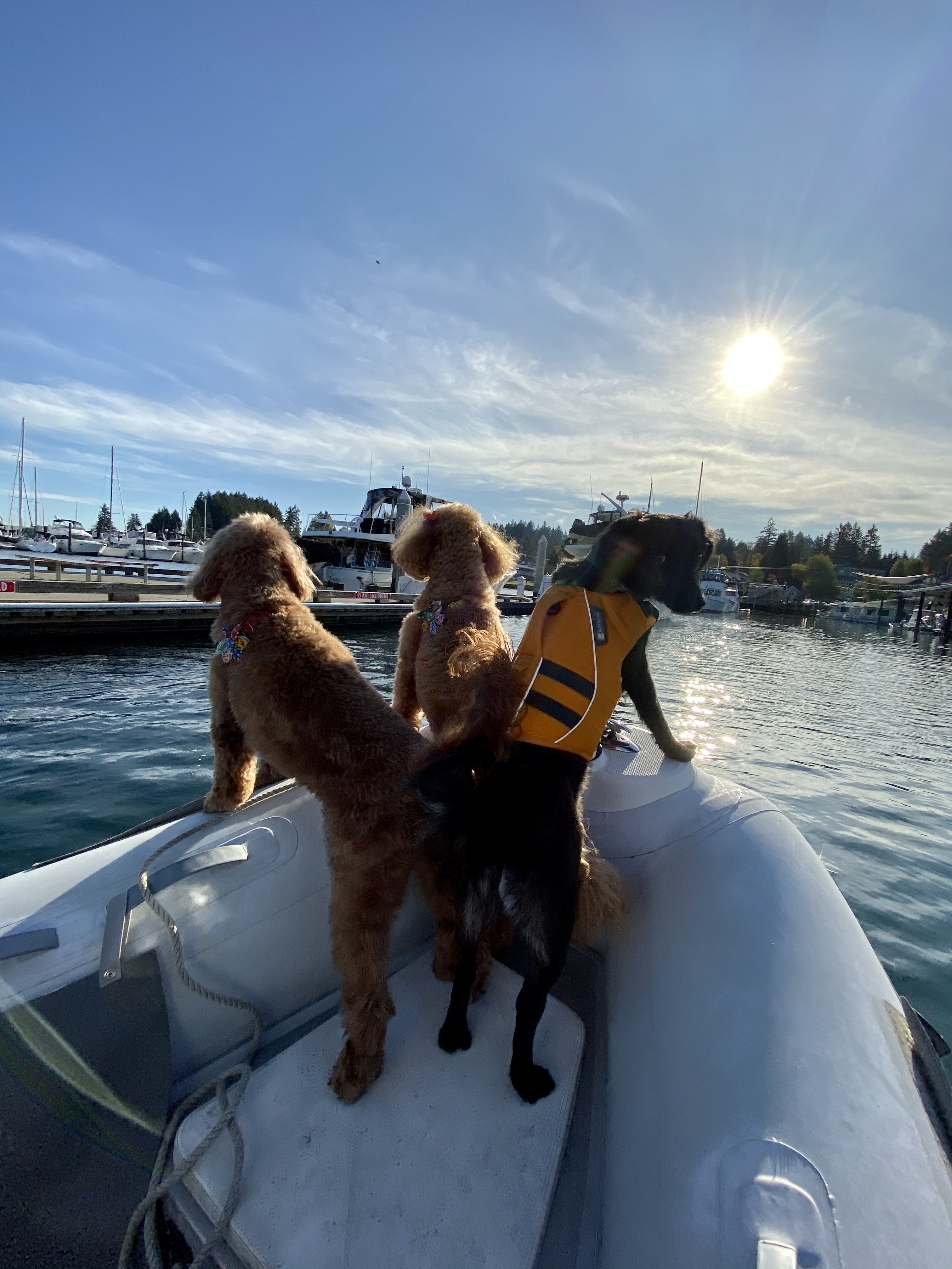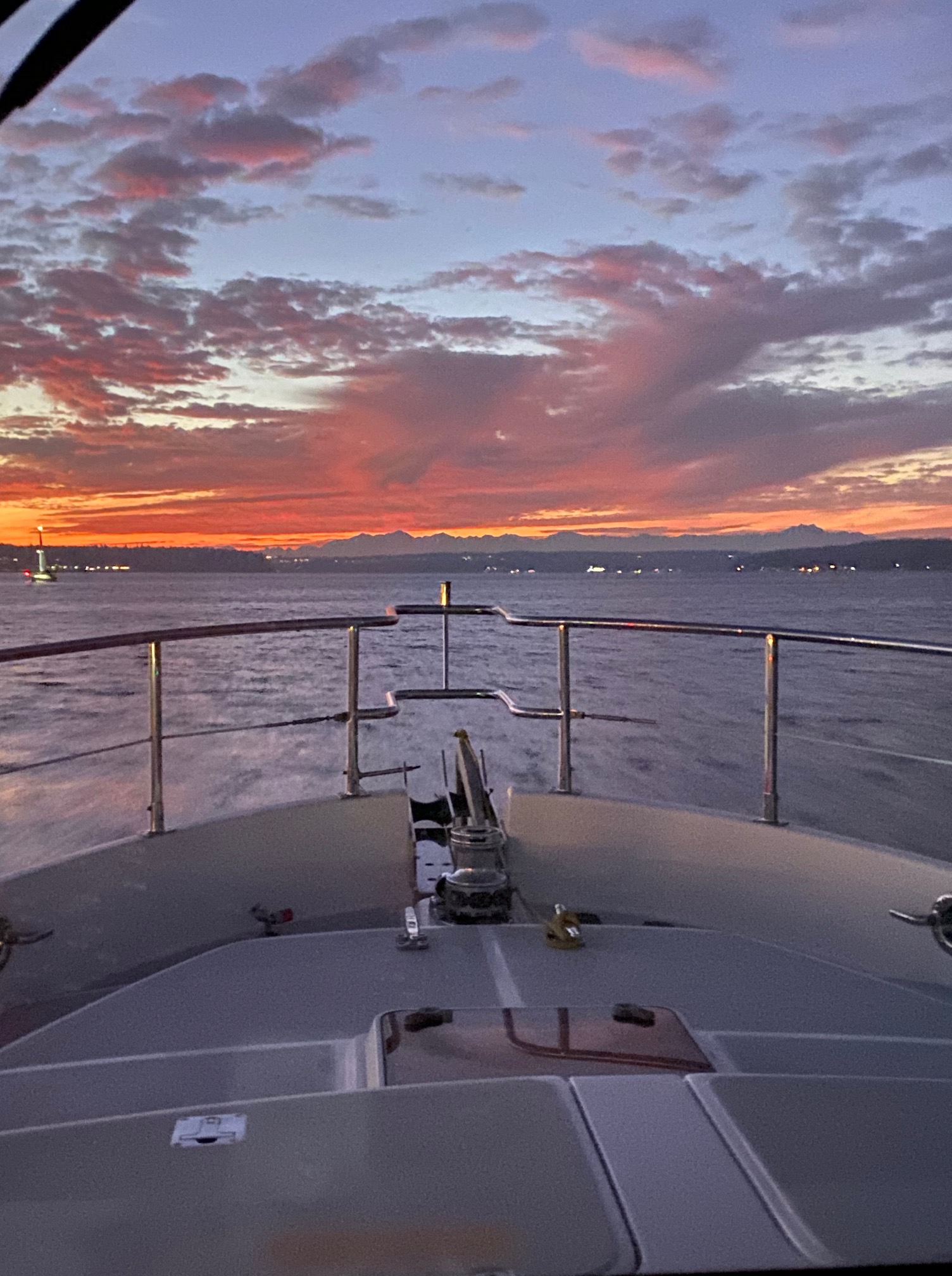 Even though we were losing daylight, we made our way slowly and arrived at the Gig Harbor public dock just after sunset. Luckily there was plenty of room and we didn’t have to try and anchor in the dark. Being that it was Piper’s first time on the boat, quick and easy access to land was convenient for her first night. As it turned out, she took to our porteguese bridge potty patch without issue! Good Dog Piper!