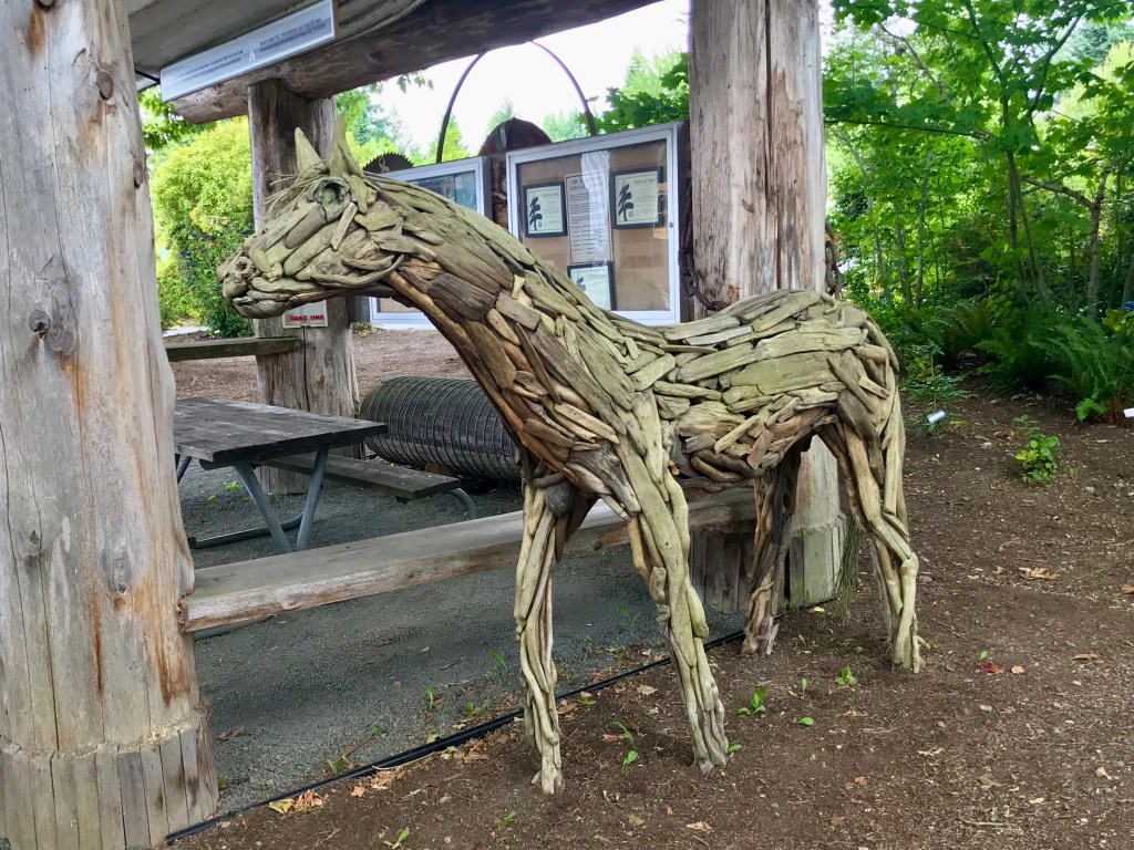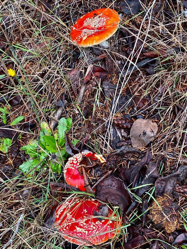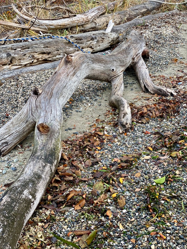 A couple of our more memorable finds on this walk were red wild mushrooms, stairs to no-where and a large piece of drift wood that really looked like a giant squid.