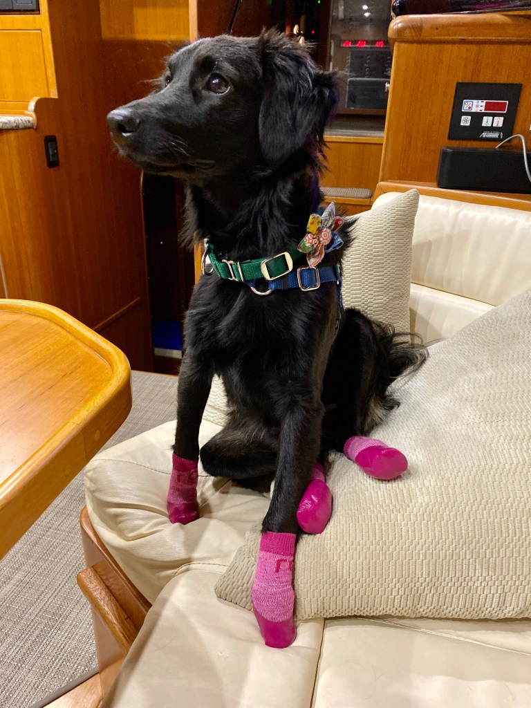 For starters, the new public dock always has space for our dinghy and its relatively easy when we need to take our three doggo’s ashore. The town of Winslow is just a couple blocks away and has many restaurants, shops, a fabulous full service grocery store and of course dog stores. In fact we found Piper a pair a pink non-slip dog socks to help her navigate the decks especially when wet! Another bonus on this location is that the local stations come in very strong and we can catch all the football on Saturday and Sunday! (Go Hawks)