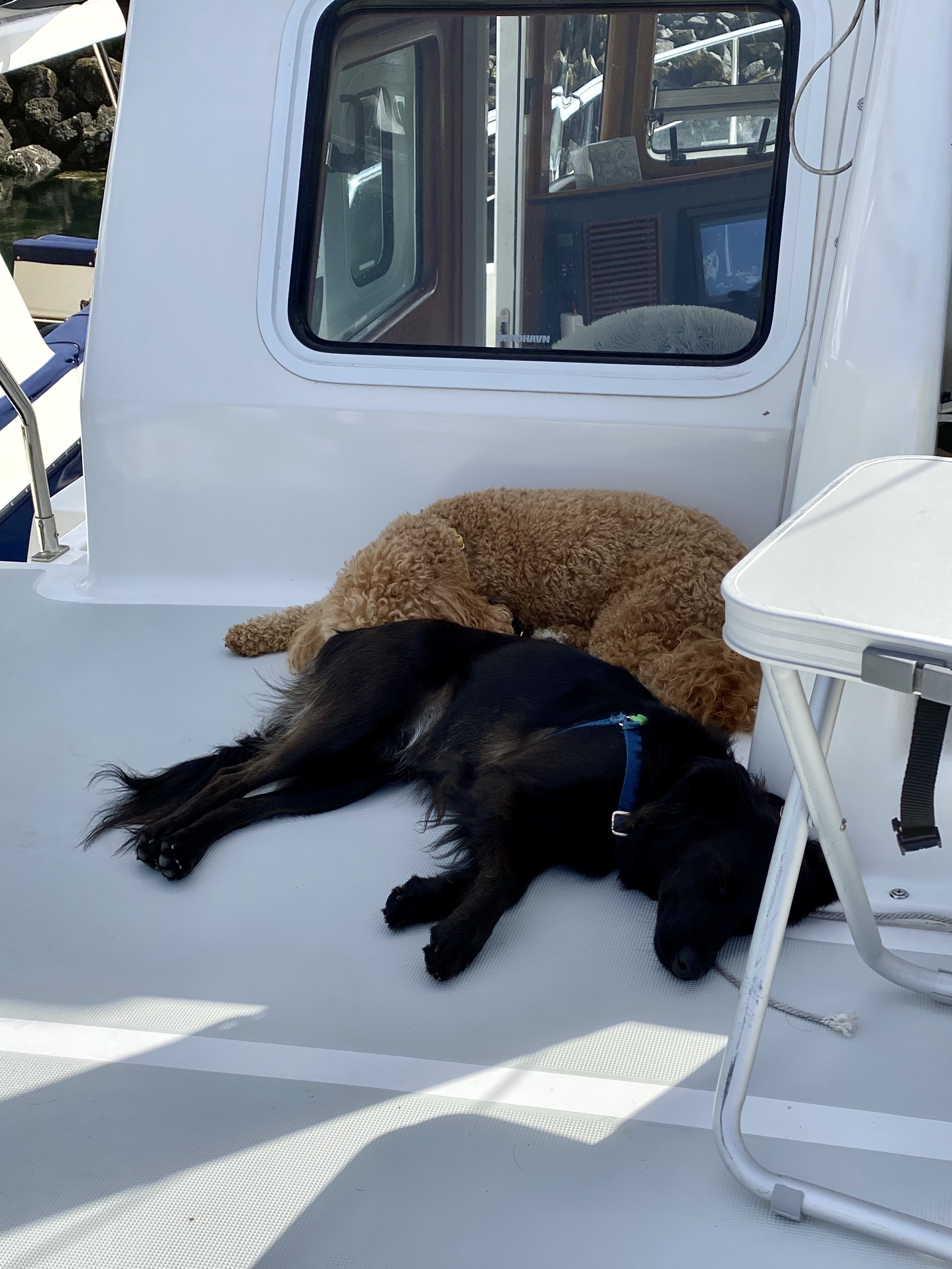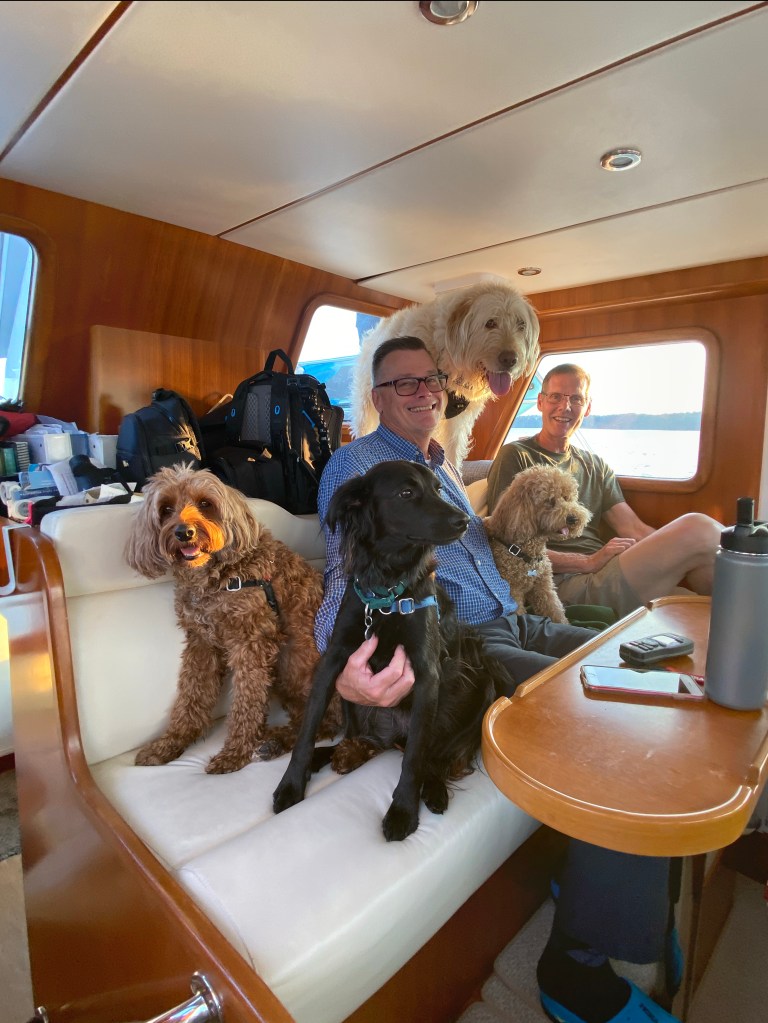Although it would seem that 4 dogs and three humans on a 40 foot vessel would be really cramped, it wasn’t at all. There was plenty of room and with our many banquettes everyone was comfy and had a spot. If you can’t tell, none of these dogs knows they’re a dog or that the floor is a good spot for them!