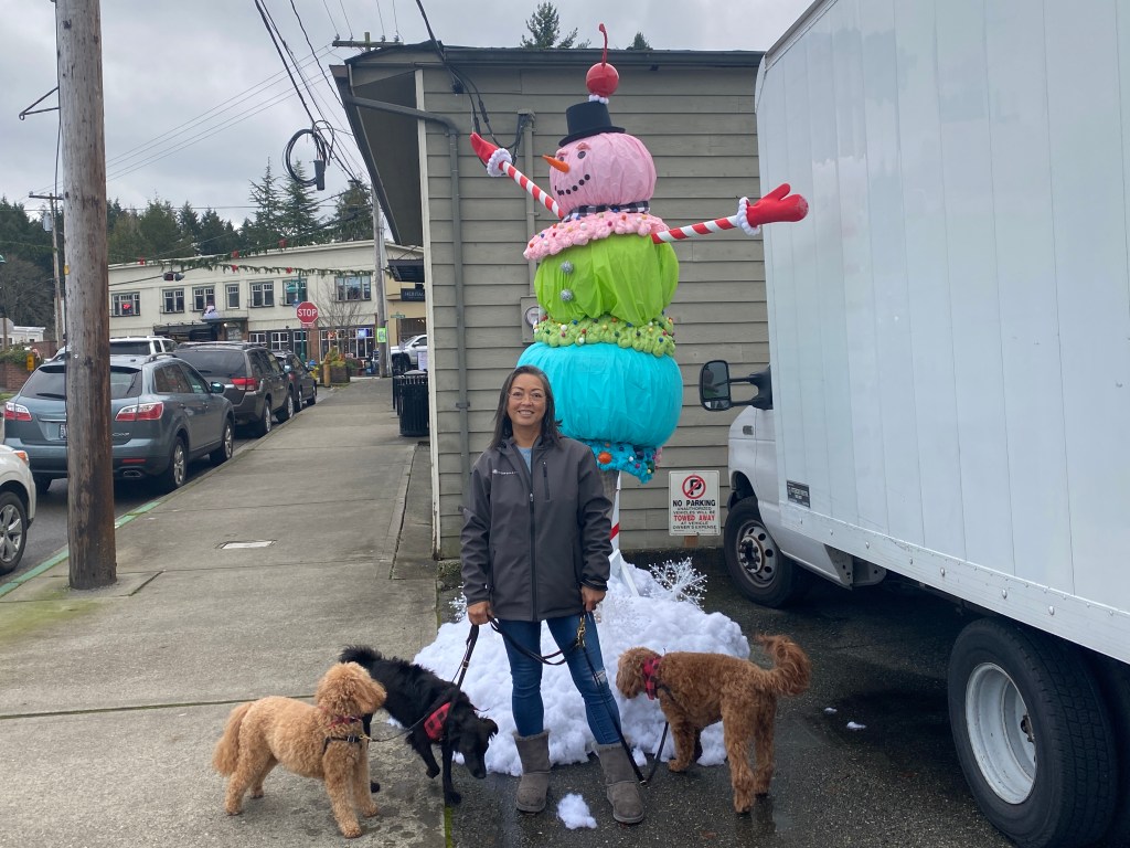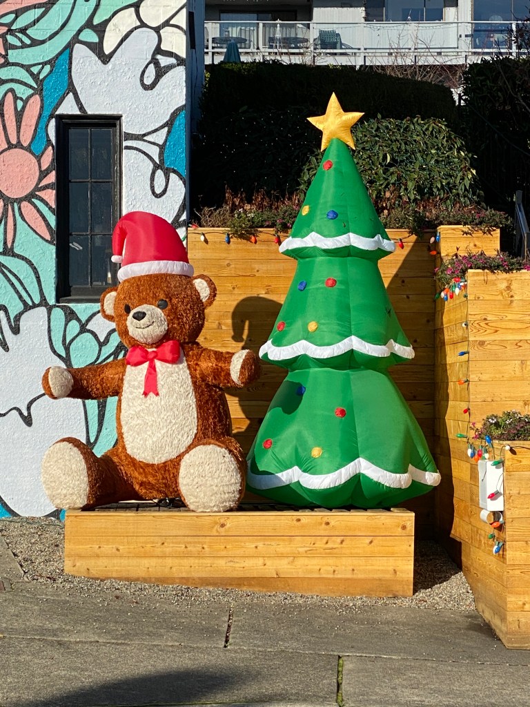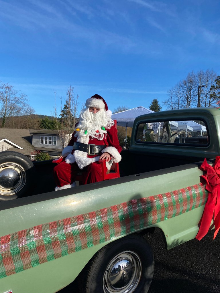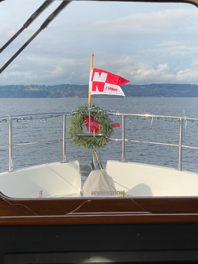 We took the fur-babies for a long walks throughout the harbor, so that when we anchored out for the parade, they would be good and tired. We found a new walking loop which might sound boring but when you visit the same local places, discovering a new path is a big deal especially when you have three dogs to walk. We checked out the local spice store, whiskey distillery and of course the marine store where we found a new ornament for our new little Christmas tree and the Captain found a new 2000 lumen work light! The phrase blinded by the light is a real thing with this work light! We walked by a pop-up tent event for veterans where local artist were selling candle, baked goods and various crafts. Santa was even present and the girls were treated with doggie biscuits. As we continued our exploration of downtown Gig Harbor we noticed that Santa really gets around as we saw him paddle boarding alongside his faithful elves around the harbor!