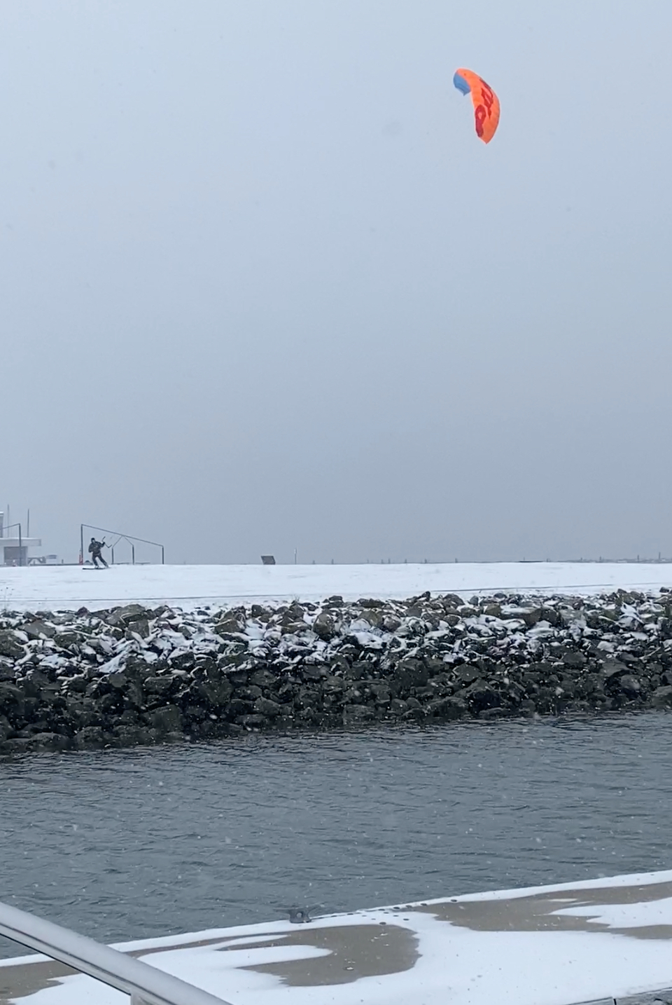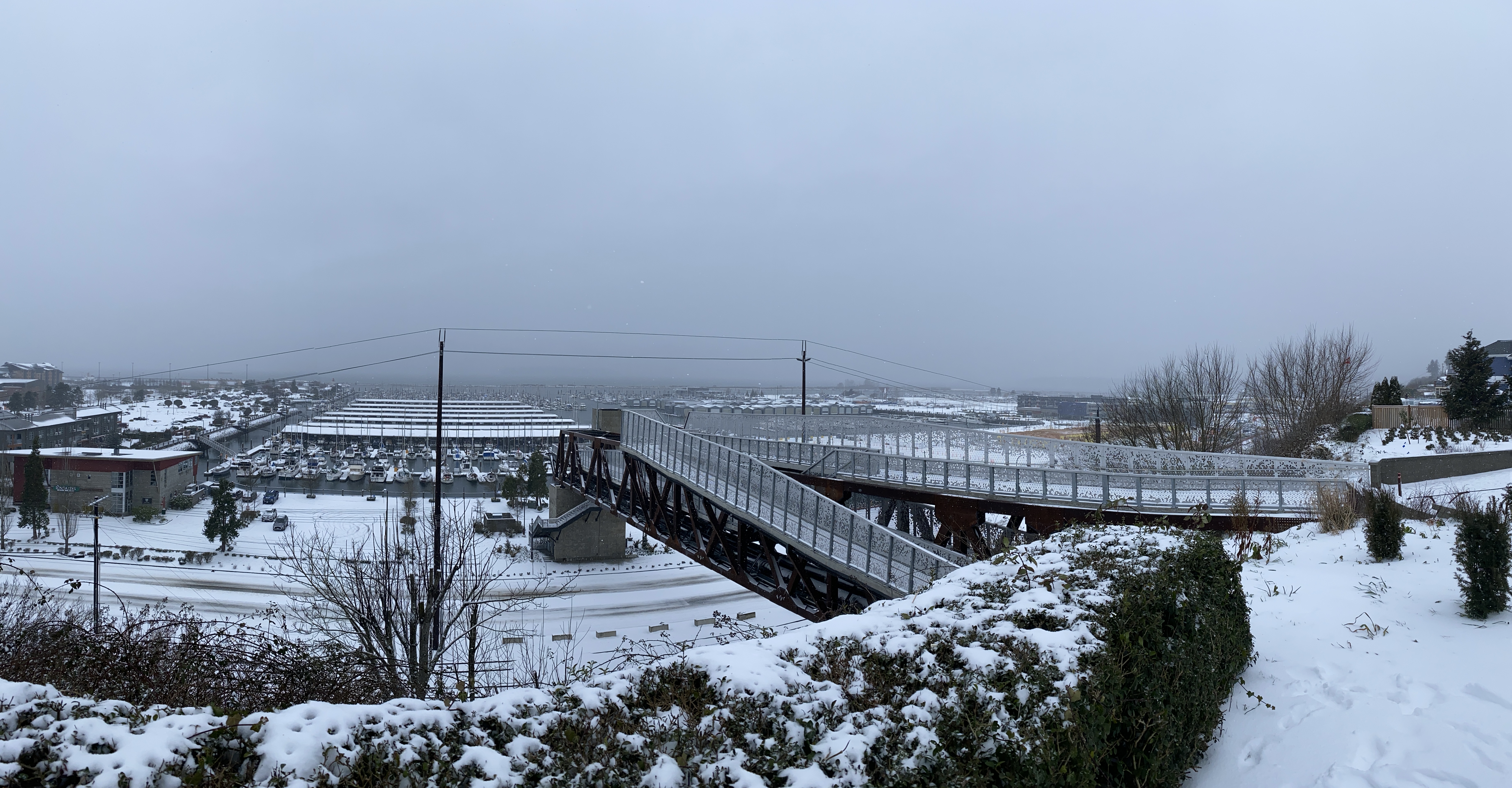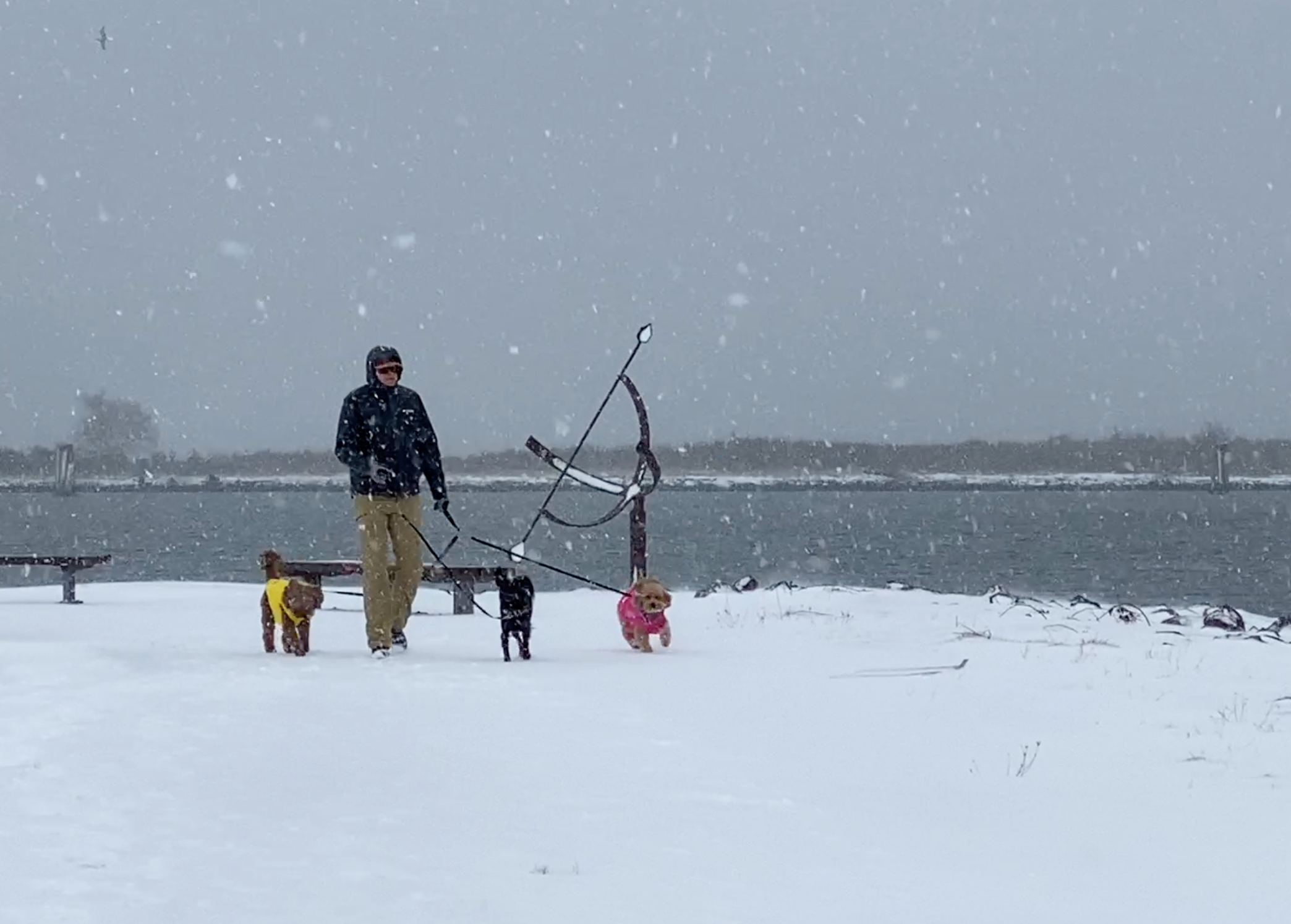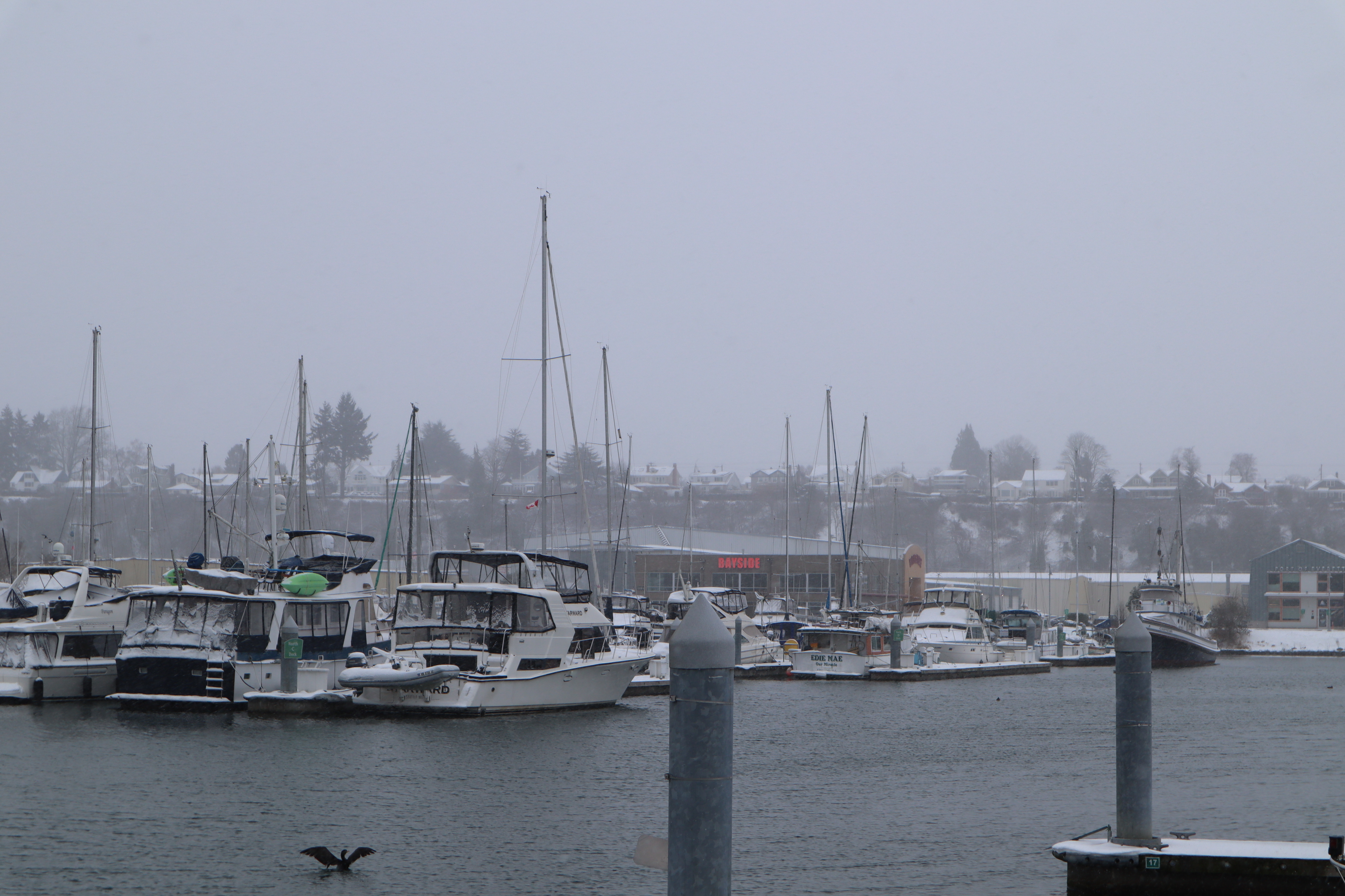 Since there is a naval base in Everett, we would have liked to see more of the base and naval ships but again, weather conditions were tough for sight seeing. We were well entertained by several kite snow boarders taking advantage of the snow and high winds in the large adjacent field. Although the weather was cold and blustery, we just enjoyed the comfort of the diesel heater, watched movies and knocked out some small interior boat projects. We really enjoyed the general splendor and view of the white snow covering pretty much everything in sight from the inside of our comfortable vessel. Of course throughout the day we had to take a few potty walks where the fur-babies thoroughly took the opportunity to play in the snow, prancing and burying there heads. Everett we will return come summer!