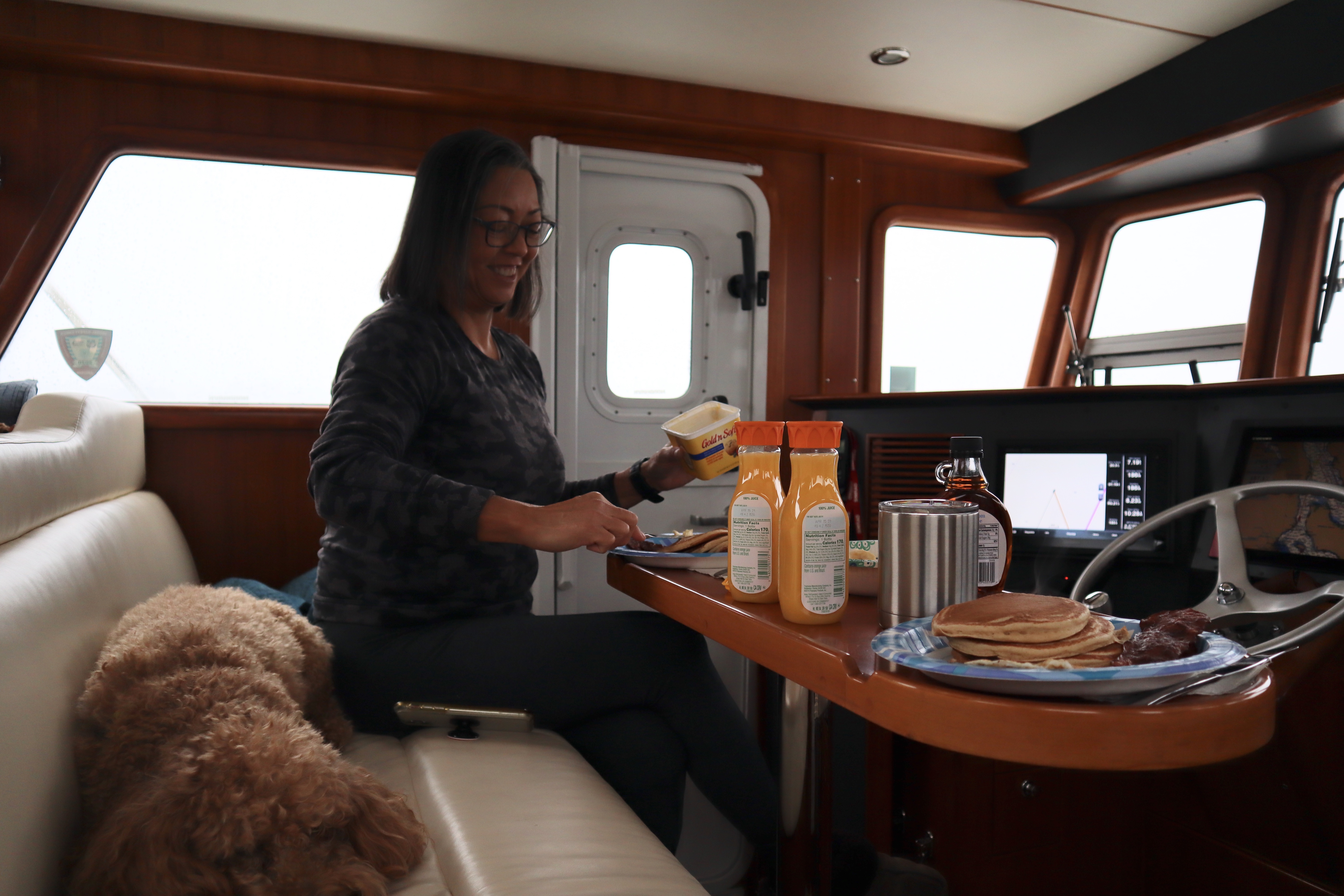 We left fairly early as the cruise to Evertt from Tacoma is a good 52 nautical miles and at an average of 6.5 knots we don’t get anywhere fast! The weather was overcast and grey but overall the cruise was fairly flat and easy. We hardly saw any other pleasure boaters the entire way. We enjoyed pancakes for breakfast underway and passed the hours practicing spanish lessons, cruise planning for this summer, and just enjoying the trip. Upon arrival at the marina, the snow really started coming down and sticking to the ground. It didn’t seem like there was going to be that much snow at first, but the snow continued all night and by the next morning there was 8 inches to a foot in some places. The snow continued the rest of our trip…