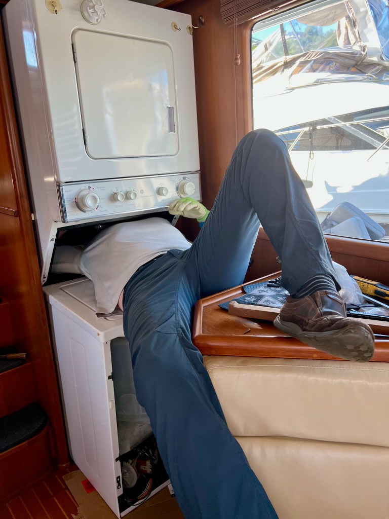 When we purchased Escapade the simmer burners of the Thermadore stove did not work and we had a very difficult time getting a repairman to the boat. Apparently since a boat is not considered residential, many appliance repair companys are not insured and upon hearing the stove was on a boat, they promptly declined. I must have called 20 different applicance repair companys before we finally found an outfit that was willing to come out and luckily they had most of the parts needed to get the burners up and running and some of the other functions working better. But as fate would have it, once the stove was fixed, the stackable Washer/Dryer unit went out. We think these appliances must be orginal and at 20 years, not surprised. Mike did his best to troubleshoot but in the end we decided to yard the w/d off Escapade and purchase individual stackables which will be more water efficient.