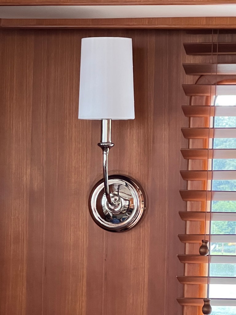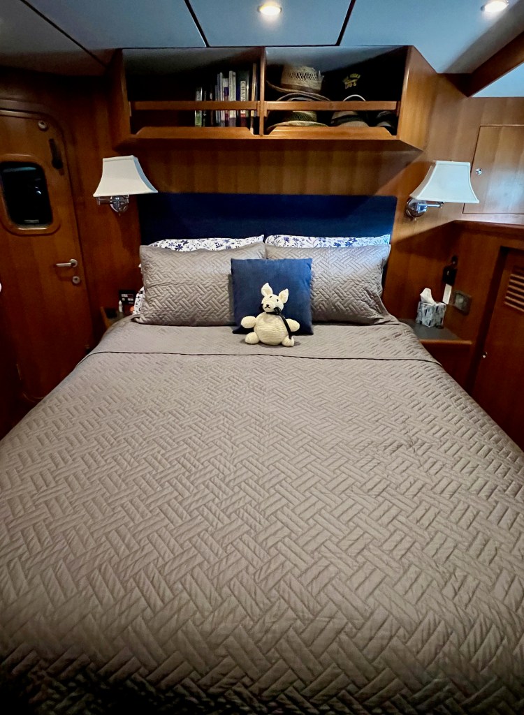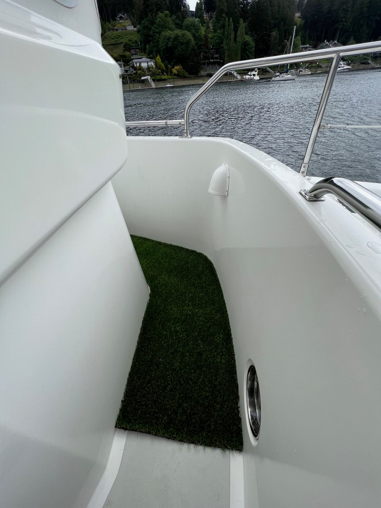 Once the primary concerns were taken care of we started in with some of the more cosmetic needs. We had our starboard boarding door’s gelcoat repaired as it was pretty beaten up and had the paint matched so we could have more gel-coat repairs done down the road. We added shower head water regulators, a new air horn, changed out the light sconces, installed new door stops, patterned the entire boat for new carpet and aqua mat, patterned a large section of the porteguese bridge for dog turf, re-upholstered the pilot house cushions, re-upholstered the main stateroom’s headboard, repaired the zippers on the back awning, sewed a new cover for the storm windows which are stored on the portuguese bridge, replaced the antiquated Bose system with an Xbox and Bose sound bar and mounted the smart TV on a swivel stand that will raise up 10″ and pivot for better viewing.