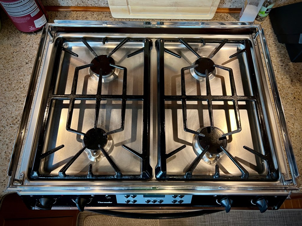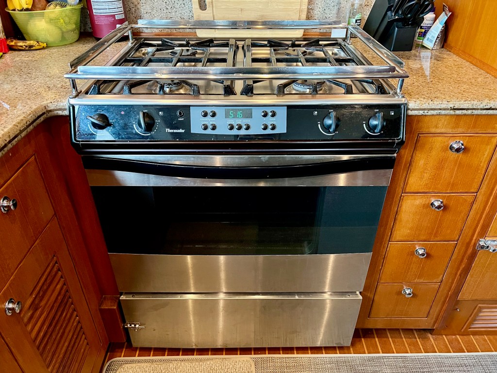 When we purchased Escapade, only the right side burners of our Thermador stove worked and several of the oven buttons would error out when pushed. We considered replacing it with a new stove but since Thermadores are such good appliances we decided to try and have it repaired. After calling many repair companies, we finally found a service that would come to the boat, but we were told there were no guarantees due to the age of the appliance. It was surprising that many appliance repair shops refused to service our appliance because they are not insured for boats or RV’s. We didn’t even know that was a thing! We discovered that parts are no longer made for our 20-year old Thermadore, but as fate would have it, the one repairman that agreed to help us, had some old parts he was hanging on to that just happened to be for our Thermadore. We are happily cooking on 4 burners and have a fully functioning Convection/Oven!