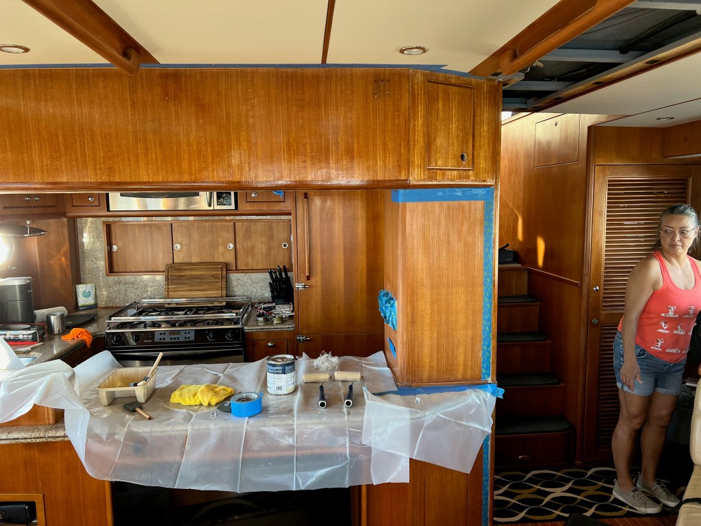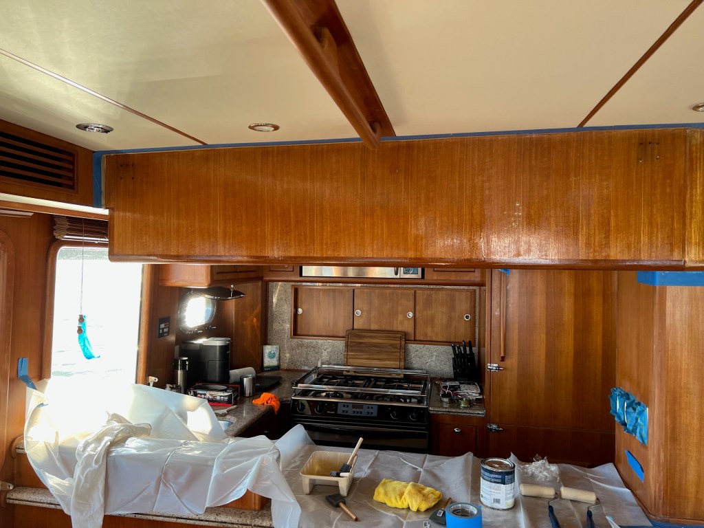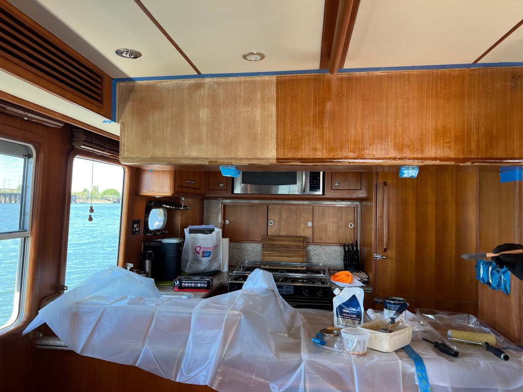 Once back from our week long trip to Victoria, we tackled some larger projects. We stripped and refinished several large sections of wood work in the salon. These areas were previously treated and not even, as you could see flashing and brushstrokes. Using Total Boat water based products, we found through C-shel’s vlog on YouTube, we dove head first into this task. It was a dusty, messy project and we had to be really careful with sanding because of the thin veneer finish. The areas we worked on came out pretty good. We were not looking for 100% but good enough. Areas where we had to remove permanently fixed speakers still show screw markings even after being plugged and sanded but overall everything looks much better. We also stripped the back teak rail which had been painted white and was chipping. Although this will need to be regularly treated, we find the look more pleasing than that of the white oil based finish. We still have more woodwork to sand and refinish in the pilot house that we hope to get to in 2023.
