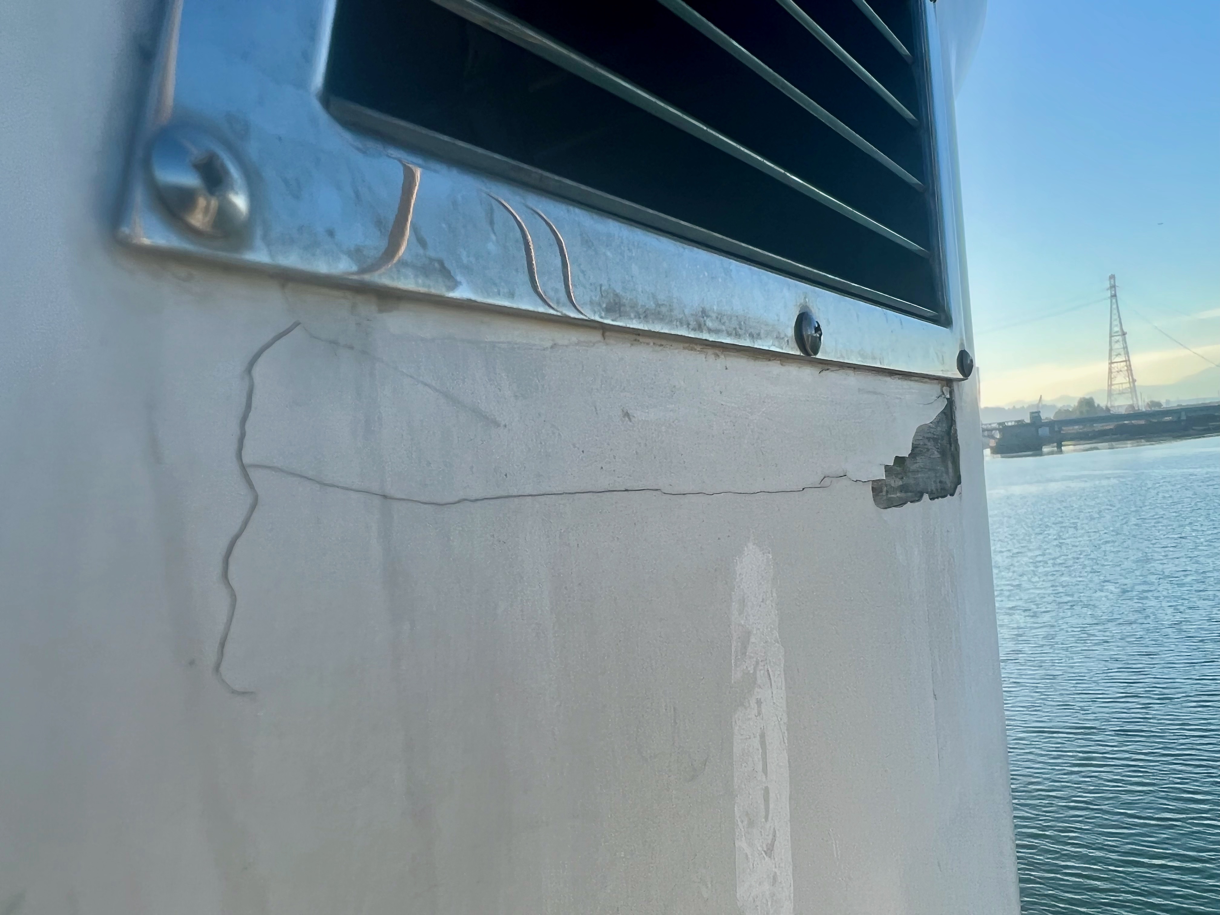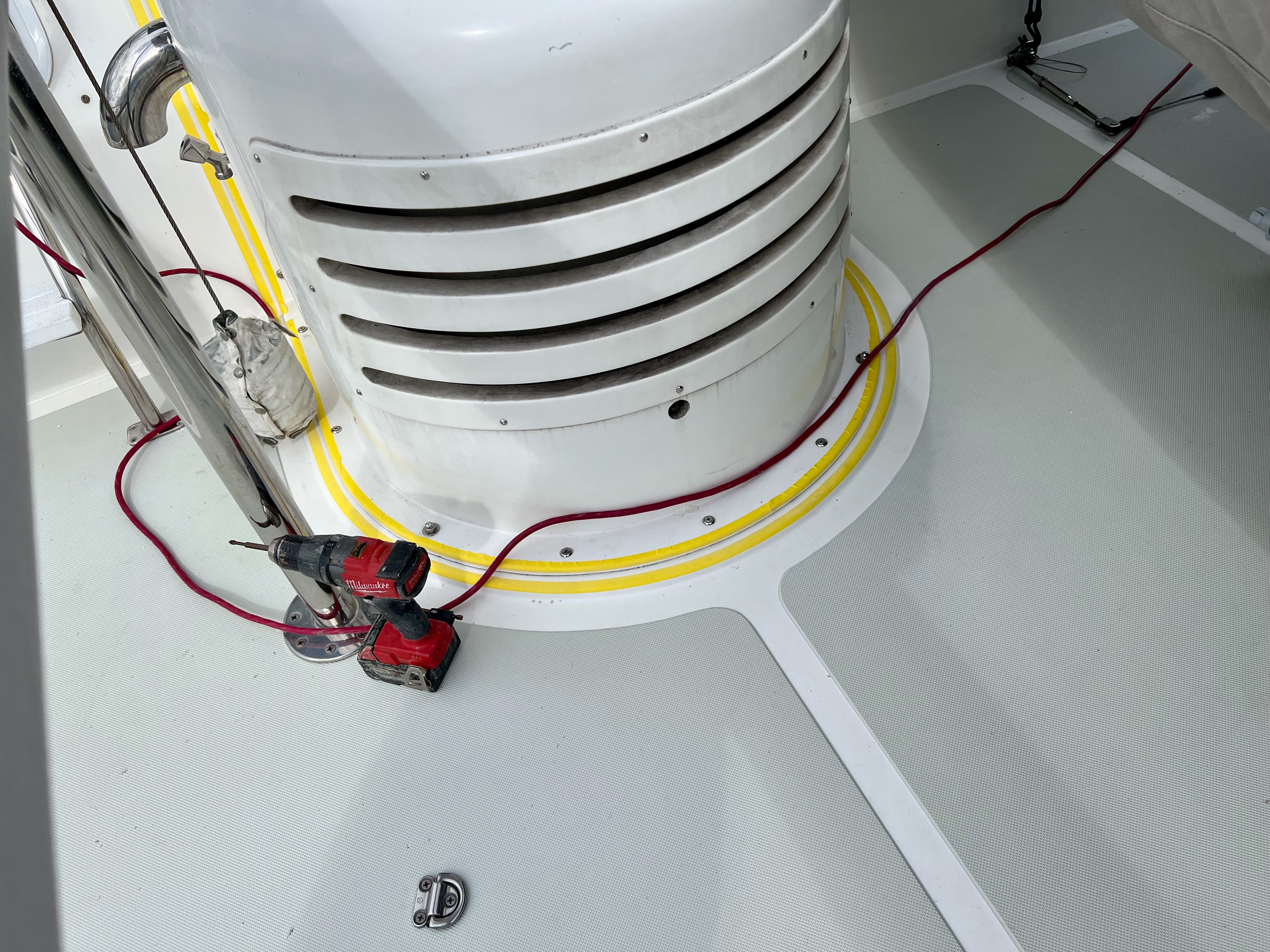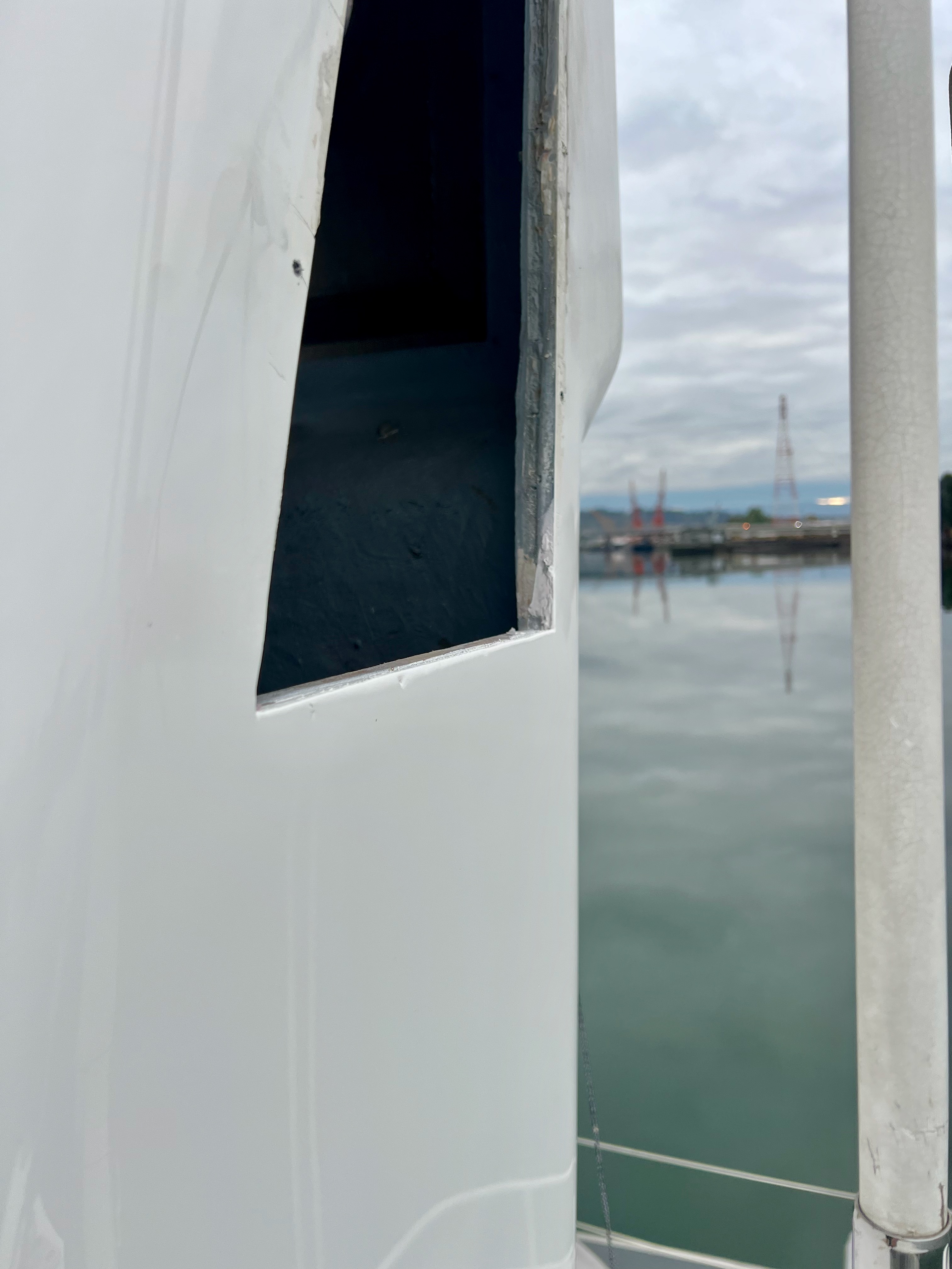 With summer coming to an end, we had to have some repairs done before the cold weather and rain. When we purchased Escapade both sides of her stack had severly chipped gel coat. There was also yellowing of gel coat in a few areas that looked as if repairs were done, but the gel coat wasn’t quite a good match. Caulking in several areas of the flybringe and stack were also in bad shape and needed replaced. We lucked out and were able to get the repairs done and what a difference, these areas are like night and day to look at now!