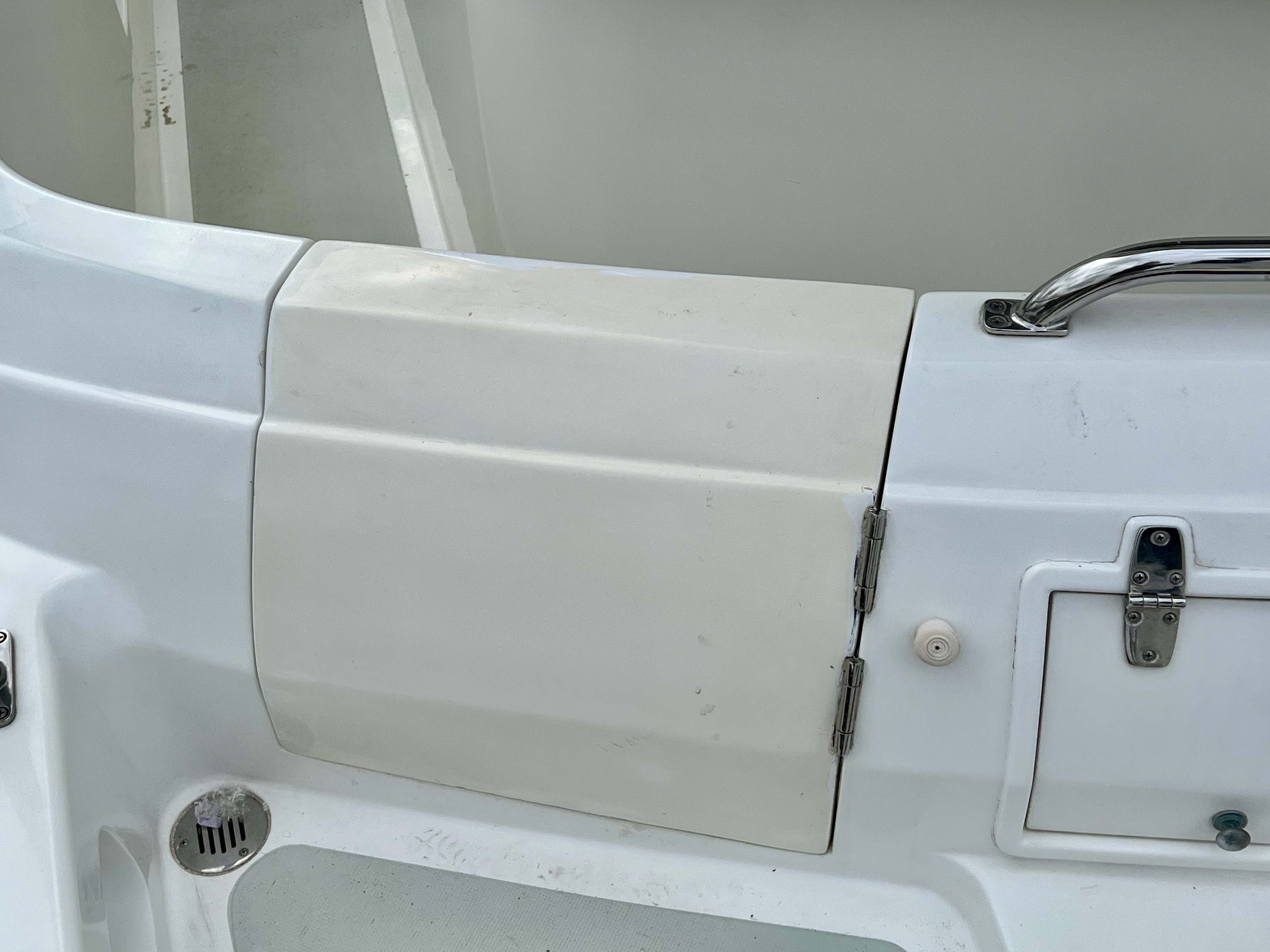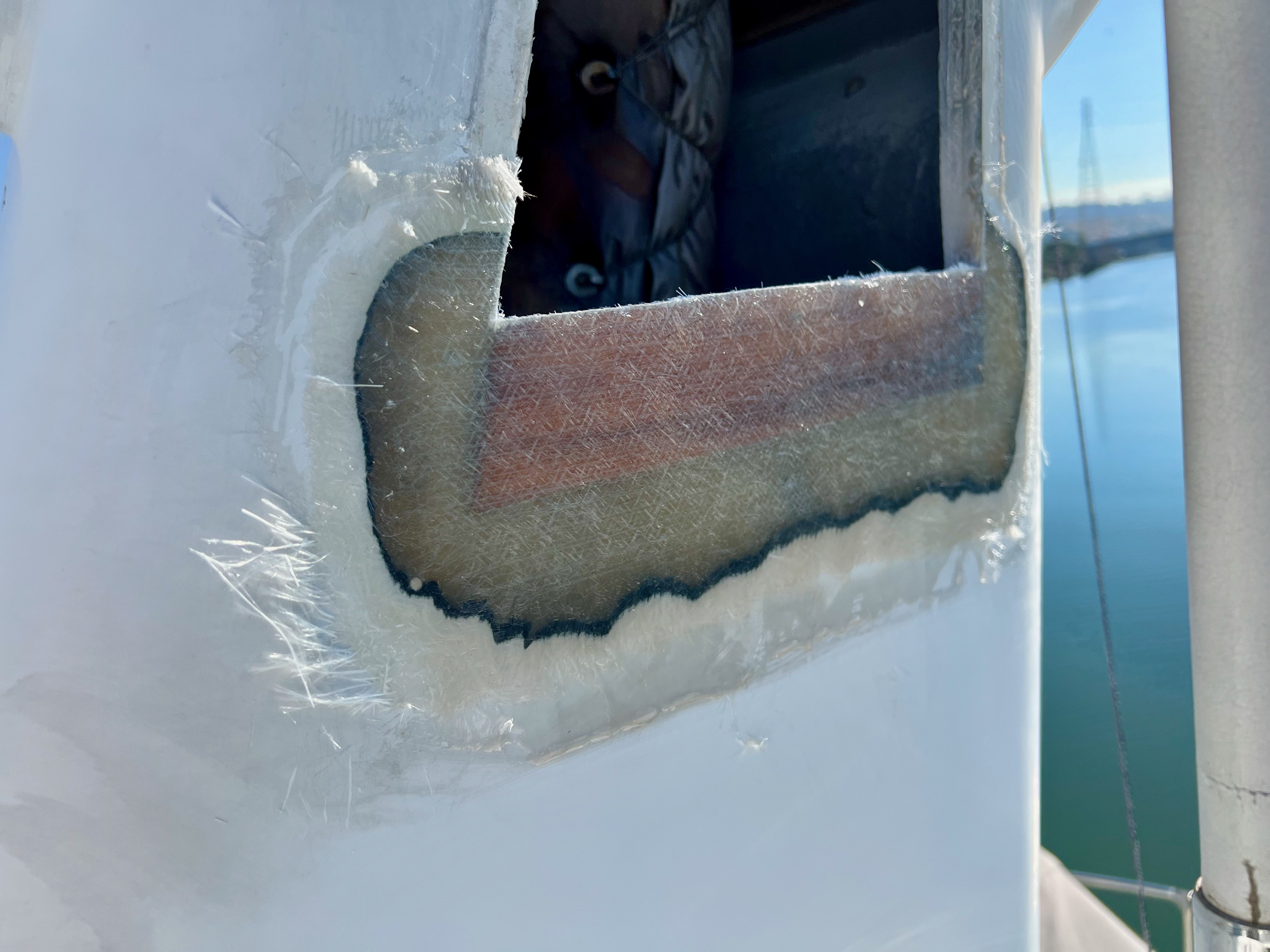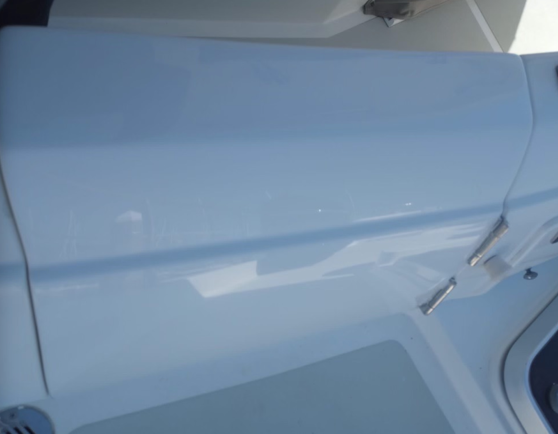 With summer coming to an end, we had to have some repairs done before the cold weather and rain. When we purchased Escapade both sides of her stack had severly chipped gel coat. There was also yellowing of gel coat in a few areas that looked as if repairs were done, but the gel coat wasn’t quite a good match. Caulking in several areas of the flybringe and stack were also in bad shape and needed replaced. We lucked out and were able to get the repairs done and what a difference, these areas are like night and day to look at now!