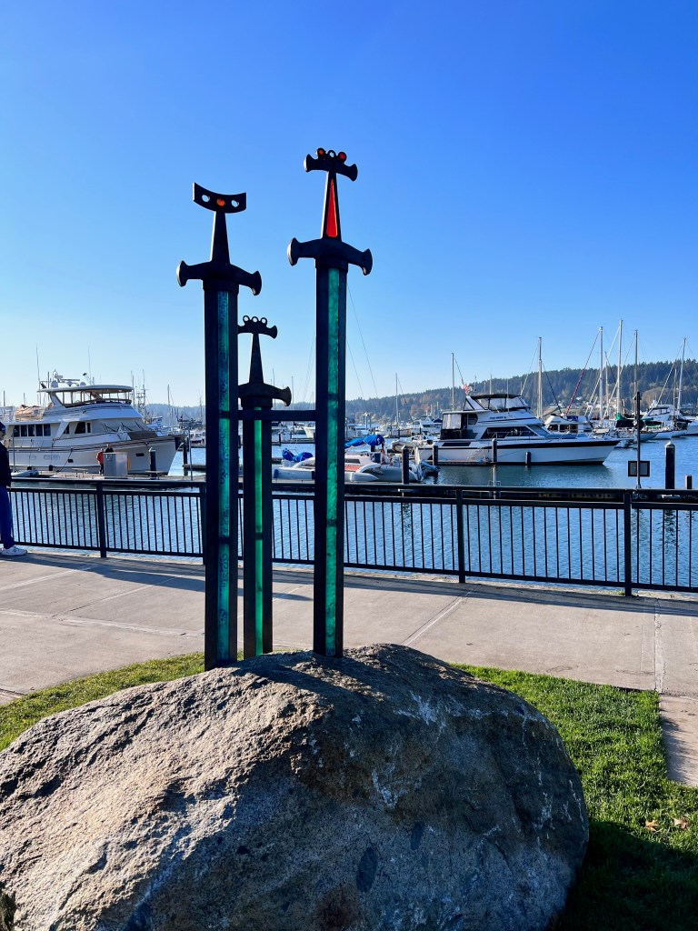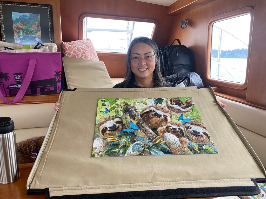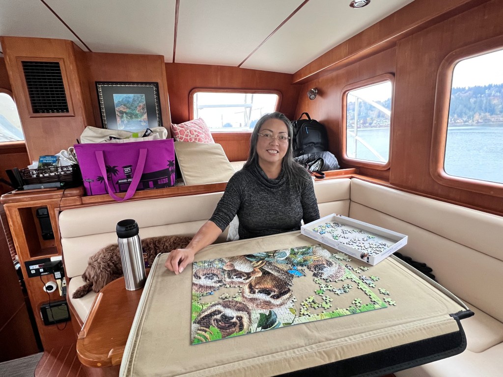 Our next cruise in mid November, we headed to Poulsbo for the 1st mate’s birthday. We took some extra time off work so we could go somewhere a little further than what our short weekends allow at an average of 6knots. The weather while cold was not too rainy, and the seas were fairly calm. Jenna was even able to work a jigsaw puzzle while underway. Once in Poulsbo we had our pick of slips and settled in. It is somewhat amaing that each time we visit a marina, even though we may have been there many times prior, we always discover something new and interesting. This time, we were intrigued by a time capsal that will not be opened until 2086. We surely won’t be on this earth when it is opened, but it gets one thinking about how much things have and will change. We also discovered an off-leash neighborhood dog park not far from the marina, surely a new favorite we will come back to.