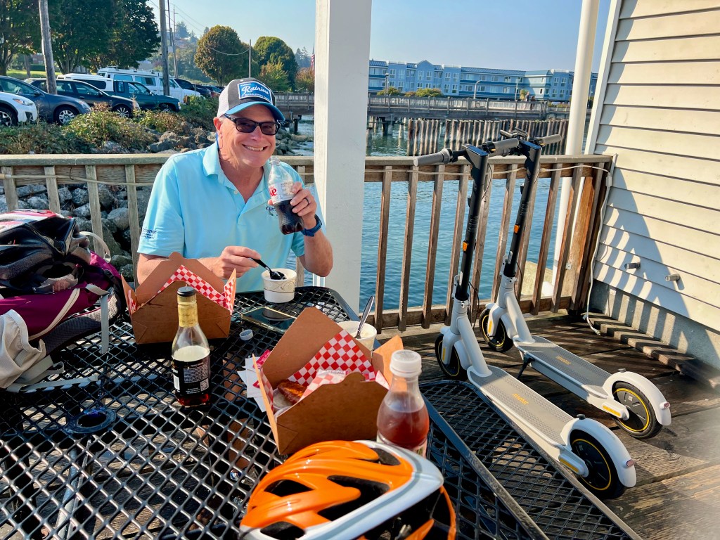 To our surprise we were blessed with an Indian summer and September was still presenting us with mild weather. We took advantage of this and headed to Tacoma to test out those new scooters we previously mentioned. Utilizing reciproal moorage at the Tacoma Yacht Club we had a great weekend. We walked the dogs to Owen’s beach which was recently remodeled and updated. We scooted all the way to Northern Fish Company and enjoyed a really good clam chowder and fresh fish lunch. This is one of our favorite local haunts. We love the proximity to Pt. Defiance park and the Rustin Waterway.
