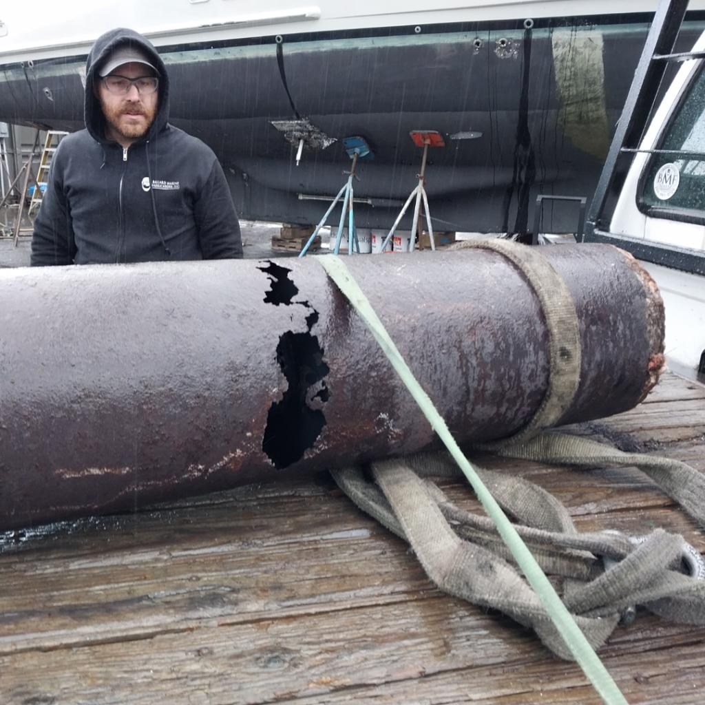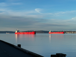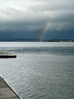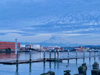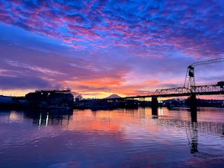 A couple days later the Captain left early to catch his train into Seattle for W-O-R-K and just after getting out of the shower, I heard a loud bang and felt the boat viciously rock. Throwing on a housecoat I went running out to see what was going on, only to find a boat had hit the bow of our boat while trying to turn into the fairway to dock. The canvas covering the aft cockpit was stuck on our bow pulpit and anchor. Everytime they tried to go forward their aft swimstep would be pulled back into our boat. Eventually the canvas ripped, freeing them from the front of Escapade. Later we learned these were new boaters, boating in the dark, on one engine because the other was out, no insurance and they were at the wrong marina. Long story short, they had purchased a somewhat derelict boat to fix up. Fortunately there is minimal damage to our bow, but that was quite the ordeal at 6am in socks and a housecoat in the middle of November!