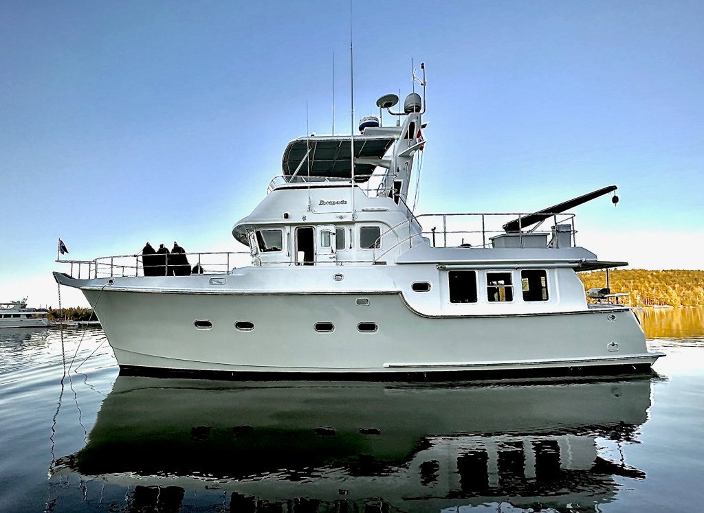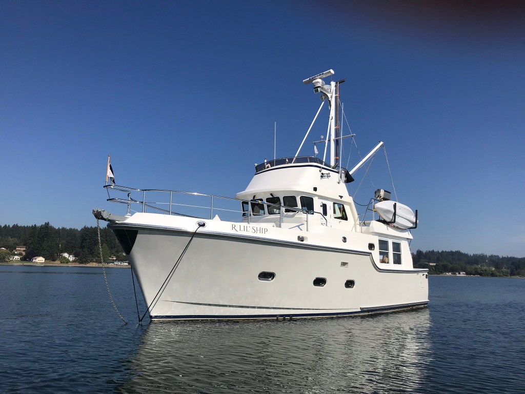 We purchased the N40, R LiL Ship and had 5 wonderful years aboard. She was agreat boat that met our needs and was completely capable of accomplishing our cruising plans. The N40 is a relatively affordable boat that can cross oceans.In late 2021 we found out that Frank had just listed a N47 for sale. It checked off the must have lists for us — fly bridge, stack, and two staterooms. Originally, it looked to be out of our price range, but since it was in Anacortes, a 2 hour drive from our home, we decided to take a drive up and take a look. The boat looked like it only needed some cosmetic help and a few upgrades to be ready to cruise. So, we made an offer that we could afford with some contingencies like finding moorage and selling R Lil’ Ship. Then we crossed our fingers and waited. All the stars aligned – the offer was accepted. Frank had a full price offer for our R Lil’ Ship the next day, within two weeks we found a new slip, and the boat passed the survey with flying colors.